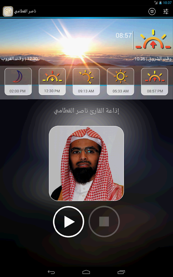 استمع للقرآن الكريم بصوت القارئ الشيخ ناصر القطامي و منبه لاوقات الصلاة حسب الموقع الجغرافي.